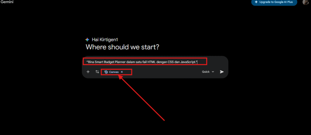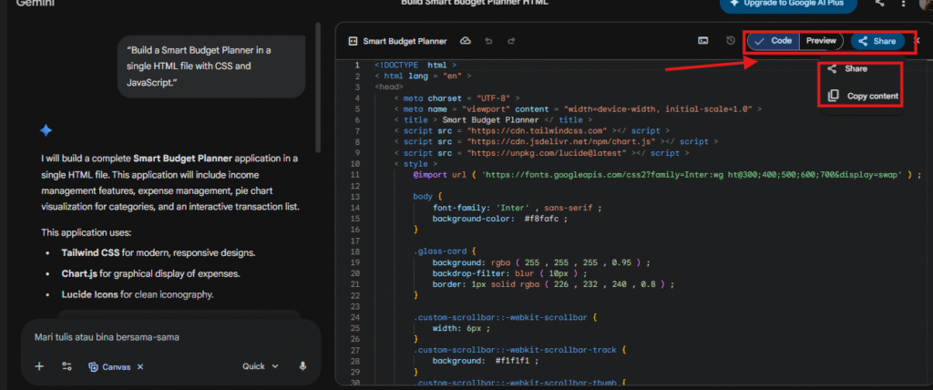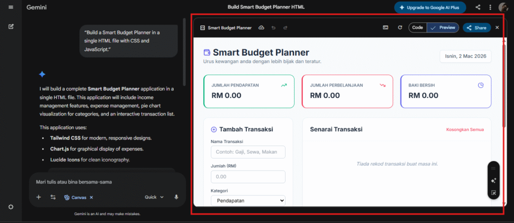 - Buka Canvas dan beri arahan seperti: “Bina Smart Budget Planner dalam satu fail HTML dengan CSS dan JavaScript.”