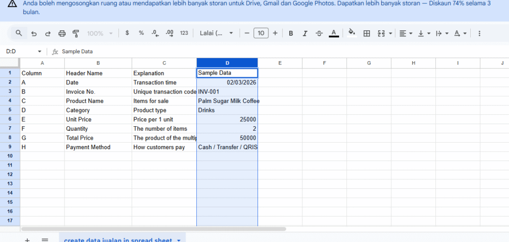 - Upload fail spreadsheet (contoh: data jualan).