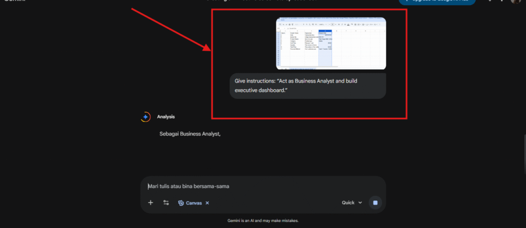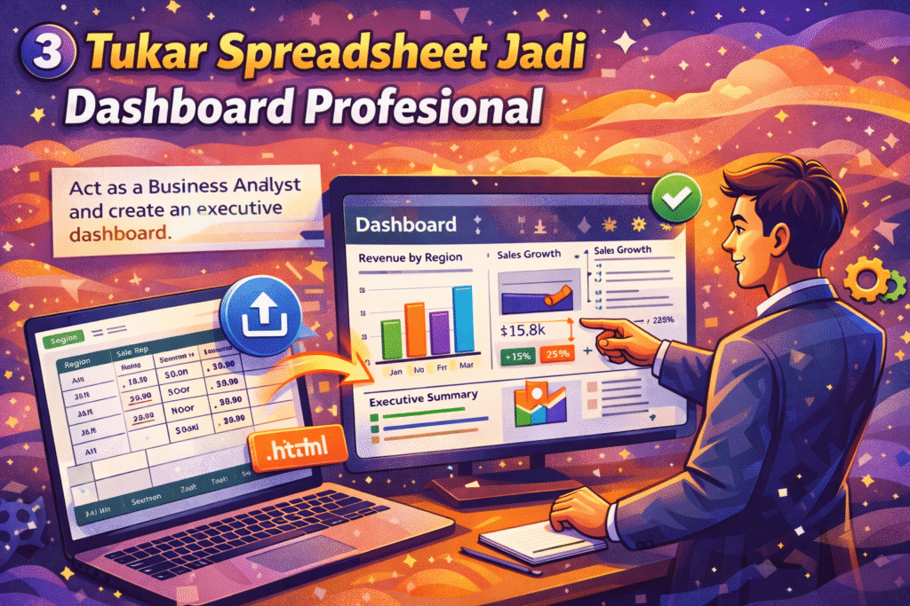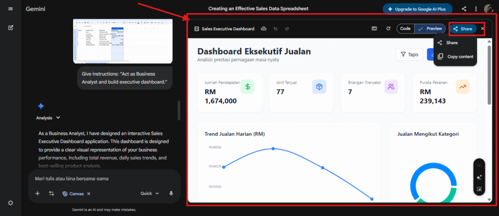 2.Berikan arahan: “Bertindak sebagai Business Analyst dan bina dashboard eksekutif.”