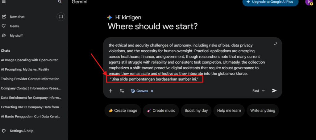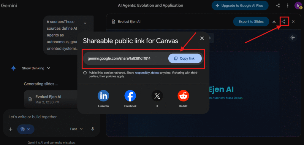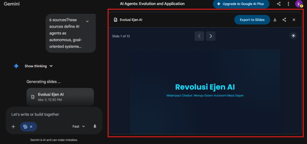 Jika anda guna NotebookLM untuk kumpul bahan, Gemini Canvas boleh tukarkannya menjadi slide profesional.