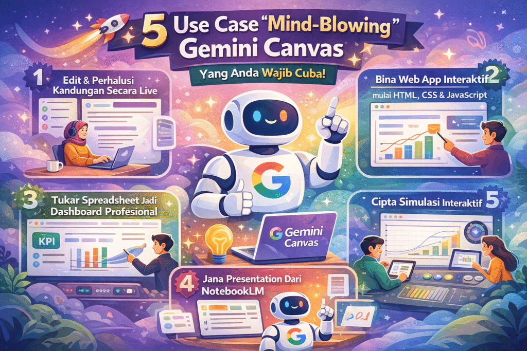 5 Gemini Canvas use case dalam dunia AI yang semakin berkembang, Gemini bukan sekadar chatbot biasa. Dengan ciri Gemini Canvas, cara kita bekerja kini berubah sepenuhnya daripada sekadar mendapatkan jawapan kepada membina output interaktif yang benar-benar berfungsi.