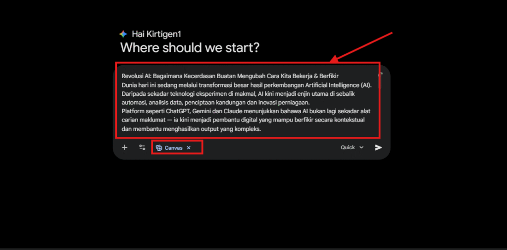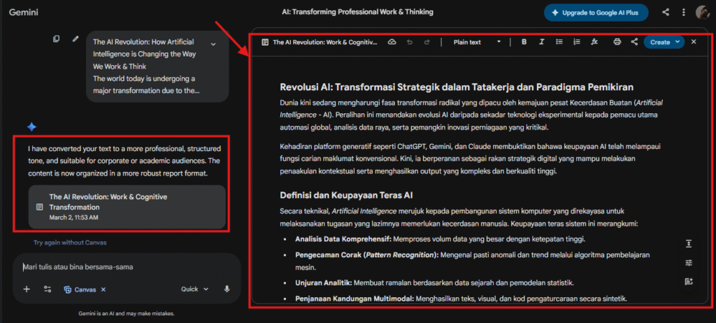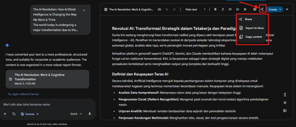 Gemini Canvas bertindak sebagai ruang kerja interaktif untuk menulis dan mengedit kandungan secara terus.