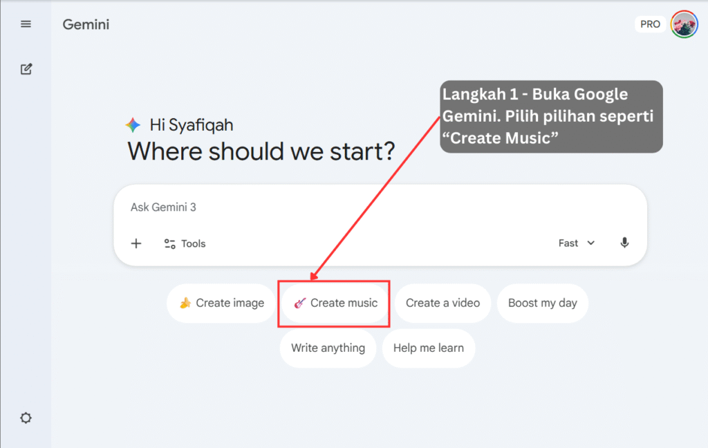 Semak menu dalam Gemini → cari pilihan “Create Music”
