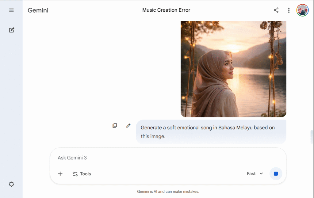 Namun, kelebihan besar Gemini ialah integrasi terus dalam AI assistant. Anda boleh hasilkan muzik tanpa keluar dari chat. Ini menjadikan ia sangat mesra pengguna biasa dan beginner.