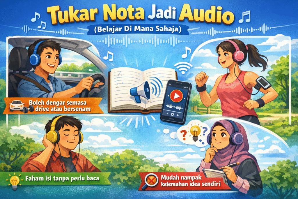 Ciri ini sangat sesuai untuk anda yang sentiasa sibuk dan tiada masa untuk membaca panjang. Daripada biarkan nota atau idea tersimpan begitu sahaja, anda boleh terus dengar dan faham isi penting hanya melalui audio di mana sahaja anda berada.