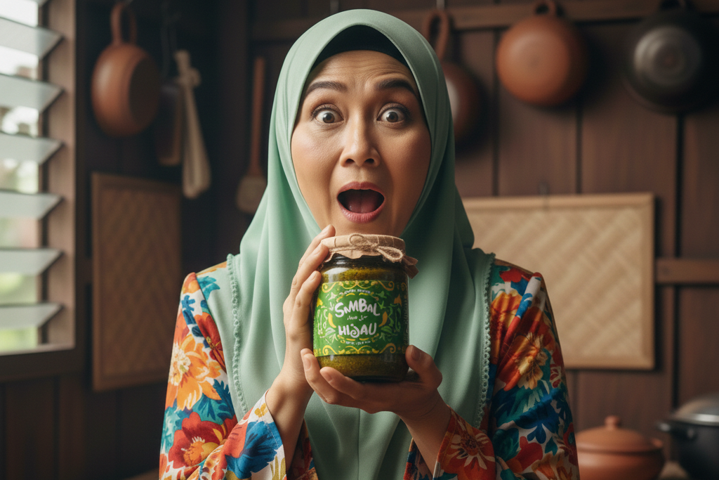 Character: [A middle-aged Malay woman in her early 50s with a heart-shaped face and expressive eyes, wearing a vibrant floral baju kurung and a pastel green headscarf. She has a warm but overdramatic persona.].