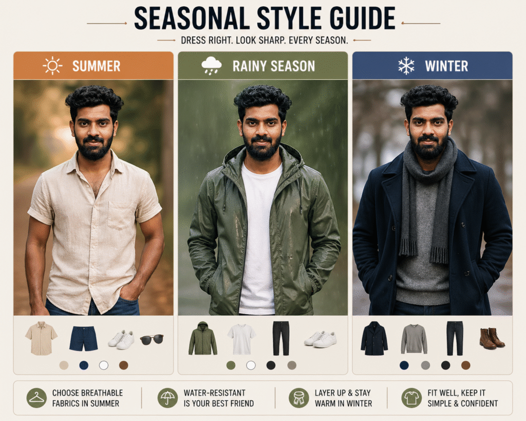 Create a seasonal clothing guide using this portrait. Show outfits for summer, rainy season, and winter styles. Make it visual-first with minimal text and clear labels.